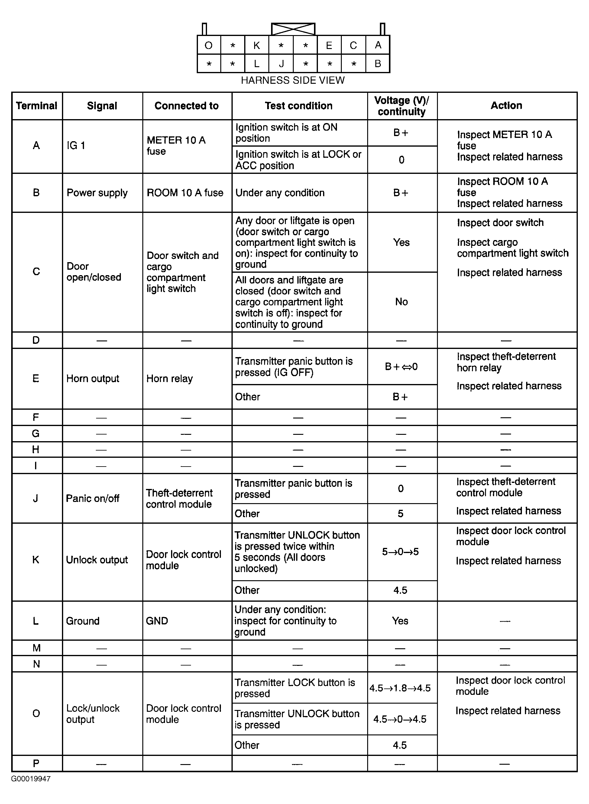 Locate keyless control module behind left rear trim panel. See Figure . Leave keyless control module connector attached. Using DVOM, backprobe specified terminals of keyless control module harness connector. See Fig 1 . Disconnect keyless control module connector before checking continuity at terminals "C" and "L". If voltage measurements and continuity checks are not as specified, check component and wiring. If component and wiring are okay, replace keyless control module. See KEYLESS CONTROL MODULE under REMOVAL & INSTALLATION.