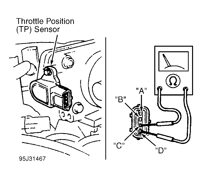 - Turn ignition off. Ensure throttle valve is in closed position. Disconnect TP sensor connector. Connect ohmmeter between terminals "C" and "D" of TP sensor connector. See Fig 1