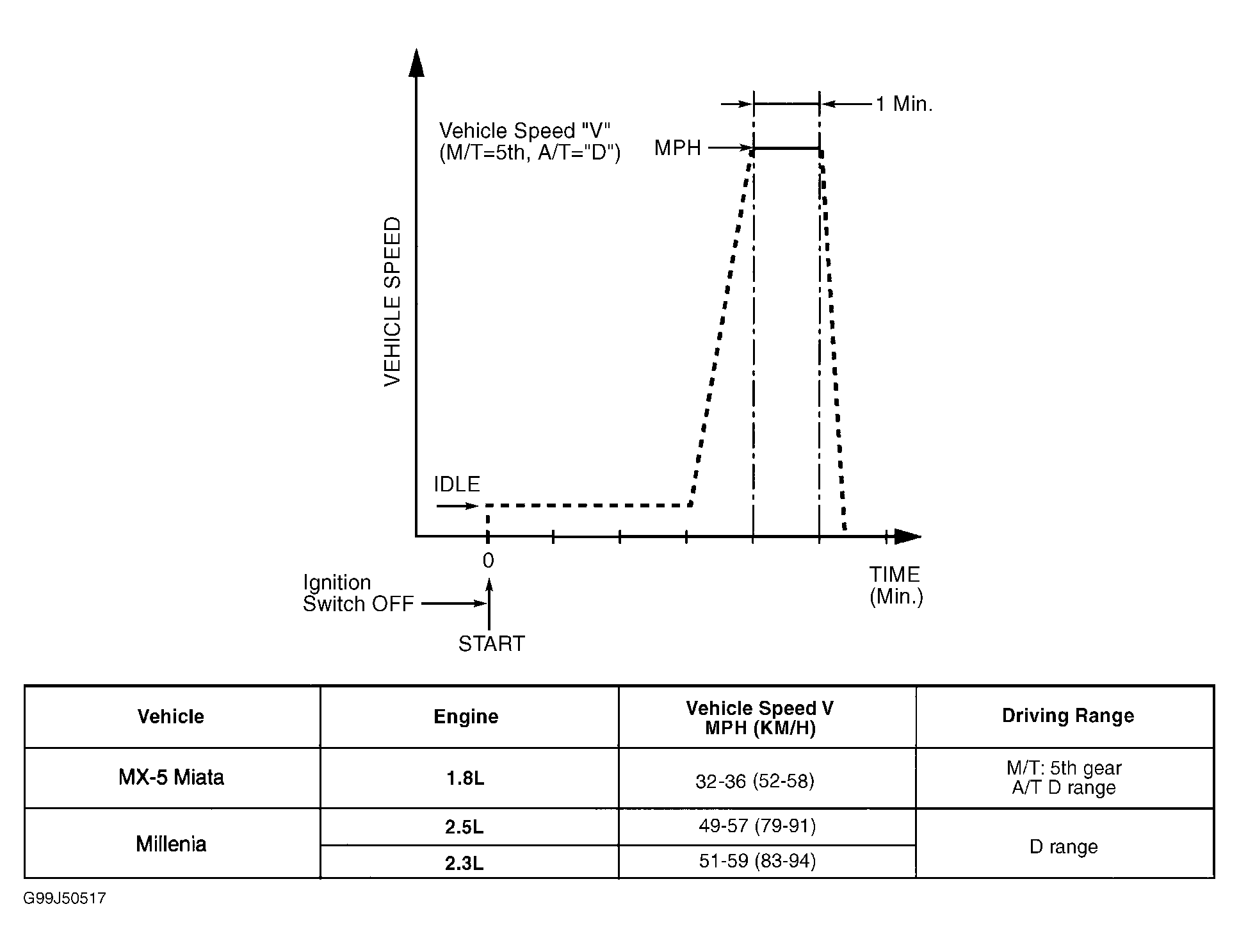 Start engine and warm to normal operating temperature. Ensure all electrical and A/C loads are off. Drive vehicle at specified speed for one minute. See Fig 1 .