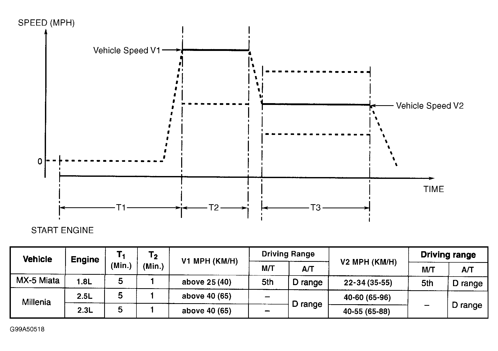 Start engine and warm to normal operating temperature. Ensure all electrical and A/C loads are off. Idle engine for additional 5 minutes. Drive vehicle at specified speed (V1) for one minute. Lower vehicle speed to specified speed (V2) for 3 minutes. See Fig 1 .