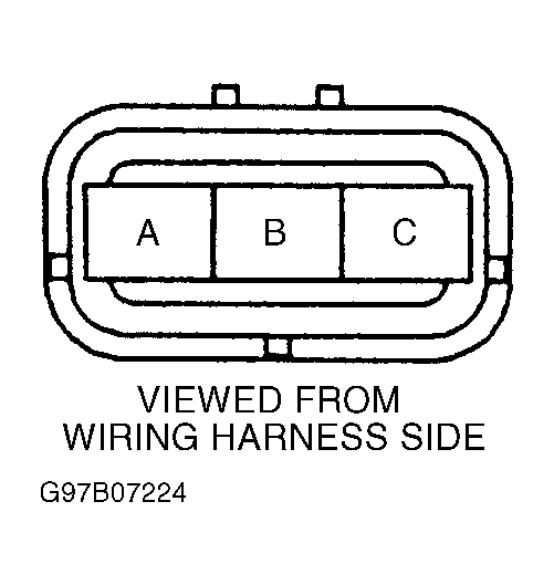 4. Turn ignition on. Measure voltage at terminal "B" at fuel pressure sensor wiring harness connector. See Fig 1 . Voltage should be less than one volt. Measure voltage at terminal "C" at fuel tank pressure sensor wiring harness connector. Voltage should be 4.5-5.5 volts. If voltage is as specified, replace fuel tank pressure sensor. If voltage is not as specified, locate and repair short circuit in wiring harness. See appropriate wiring diagram in WIRING DIAGRAMS article.