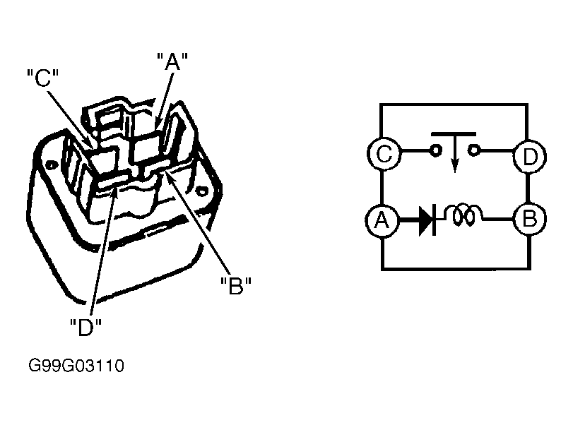 Disconnect negative battery cable. Disconnect fuel pump relay connector, located above accelerator pedal. Check continuity between relay terminals "A" and "B". See Fig 1 . Continuity should exist. Using jumper wires, connect positive battery terminal to relay terminal "A". Connect relay terminal "B" to battery negative terminal. Continuity should exist between relay terminals "C" and "D". Replace relay if continuity is not as specified.