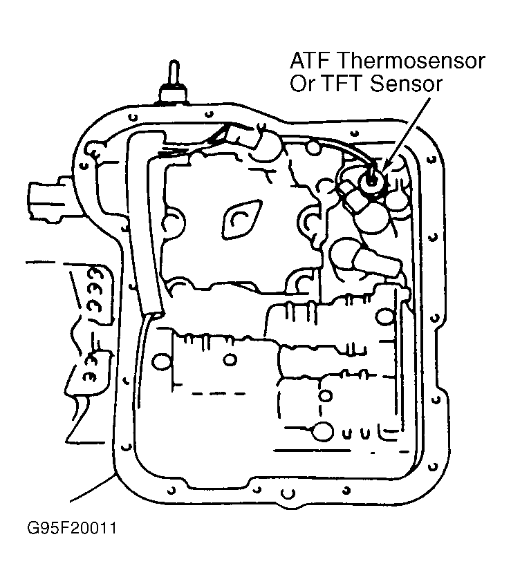 Turn ignition switch to OFF position. Remove valve body cover. Disconnect TFT sensor connector. Remove TFT sensor. See Fig 1. Connect DVOM test leads to TFT sensor terminals. Place TFT sensor and a thermometer in a container of ATF and heat ATF gradually. DO NOT allow thermometer or TFT sensor to touch bottom of container. Monitor thermometer and ohmmeter readings. Resistance should decrease as fluid temperature increases. See TRANSAXLE FLUID TEMPERATURE SENSOR RESISTANCE table. If resistance is not within specification, replace TFT sensor. If resistance is within specification, repair or replace transaxle internal harness to TFT sensor as necessary.
