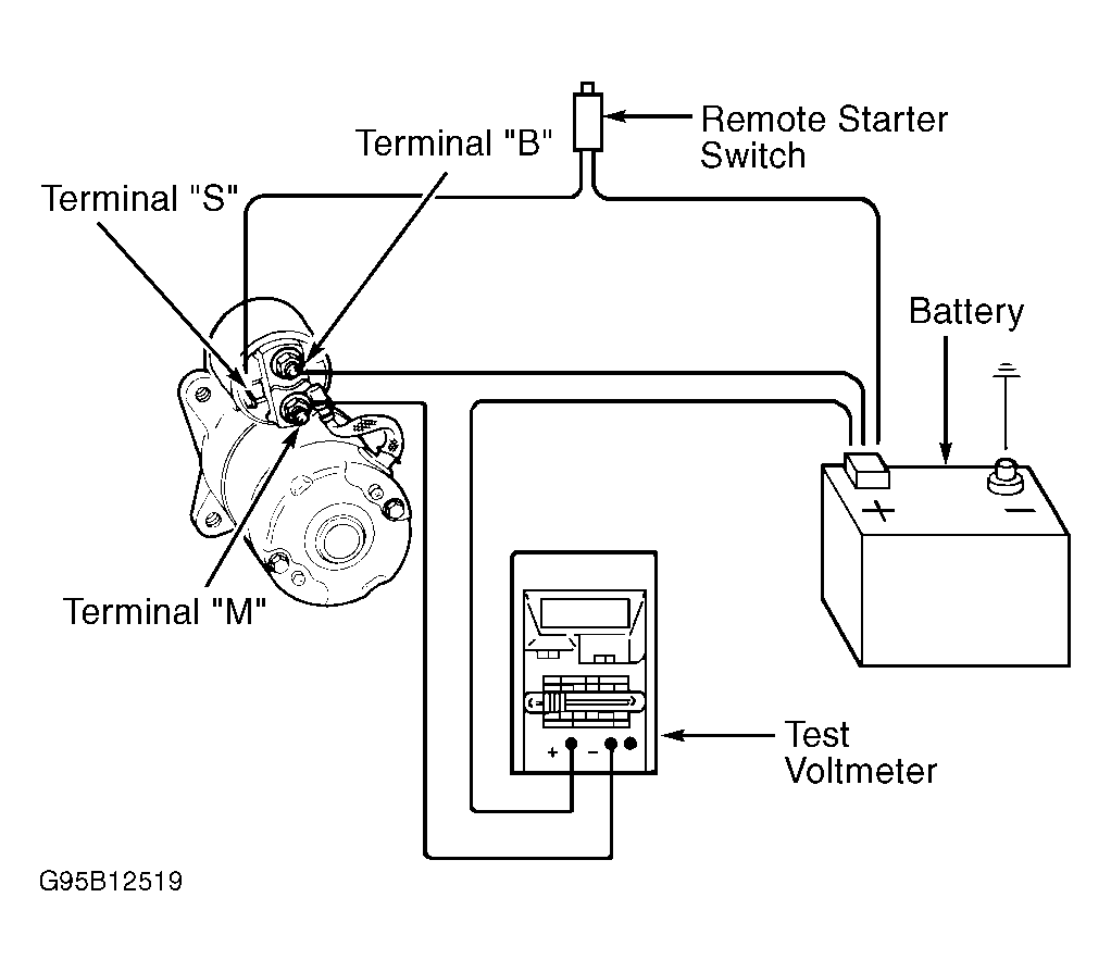 - Move negative voltmeter lead to solenoid terminal "B". Engage remote starter switch while observing voltmeter. If greater than 0.5 volt exists, recheck all starter solenoid connections. Ensure connections are clean and tight. Recheck voltage drop. If greater than 0.5 volt still exists, replace positive battery cable. Retest system.