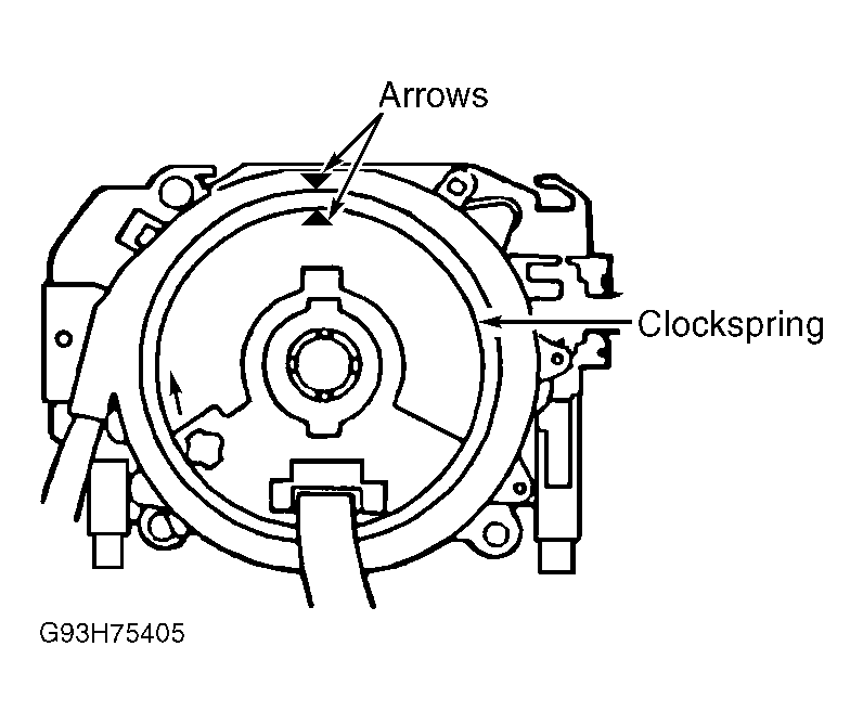 Set front wheels in straight-ahead position. Rotate clockspring clockwise until it stops (DO NOT force). Rotate clockspring 2-3/4 turns counterclockwise. Rotate clockspring further, if necessary, to align arrows on clockspring and outer housing. See Fig 1 .