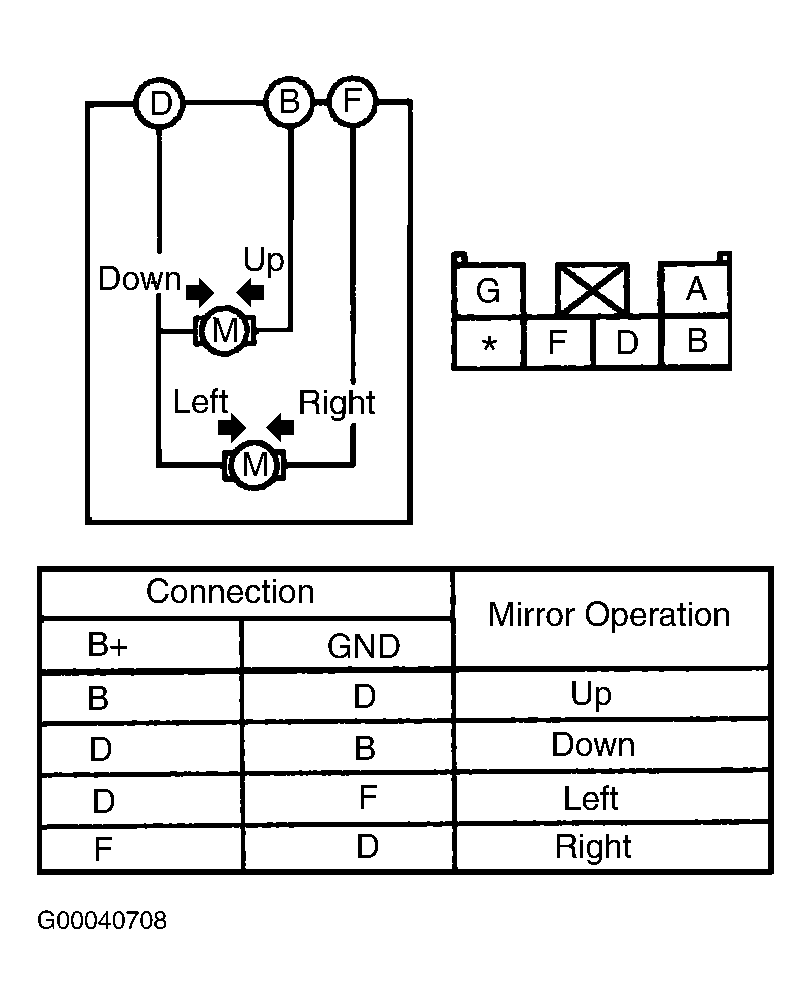 Disconnect power mirror motor harness connector (remove door trim panel if necessary). See POWER MIRROR ASSEMBLY  under REMOVAL & INSTALLATION. Apply battery voltage and ground to specified terminals of power mirror motor connector. See Fig 1 through Fig 4 . If mirror does not move as specified, replace power mirror assembly.