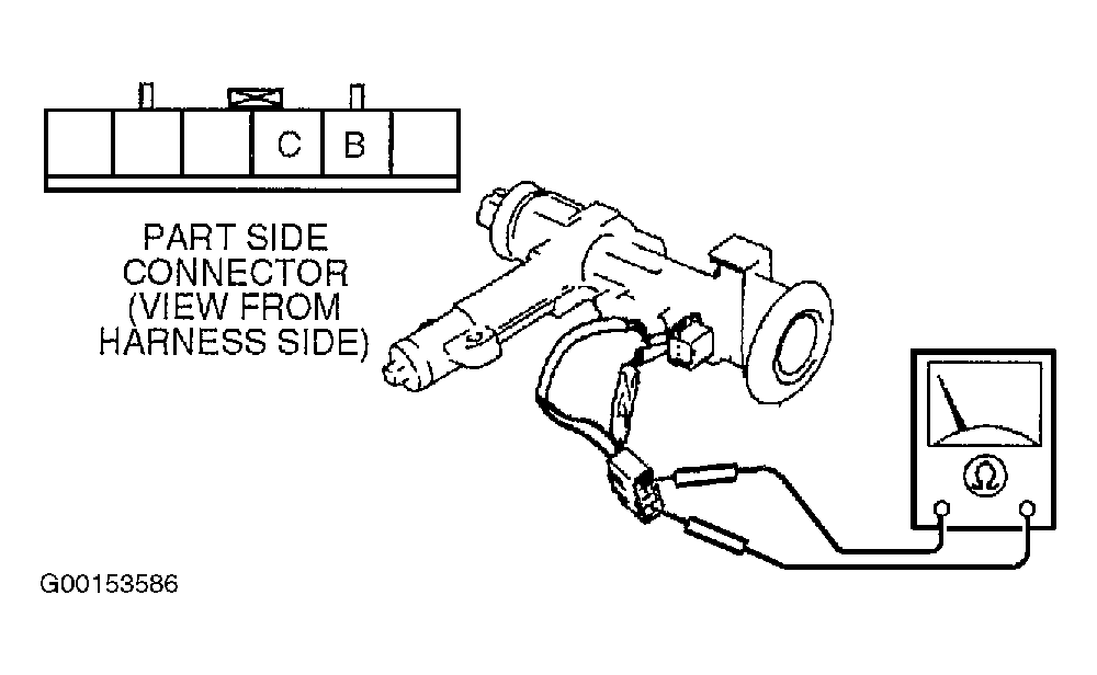 2. Inspect for continuity between terminals "B" and "C". See Fig 1 . Continuity should be present. Replace key interlock solenoid as needed. See KEY INTERLOCK SOLENOID  under REMOVAL & INSTALLATION. Connect the key interlock solenoid connector. Install the instrument cluster. Connect the negative battery cable.