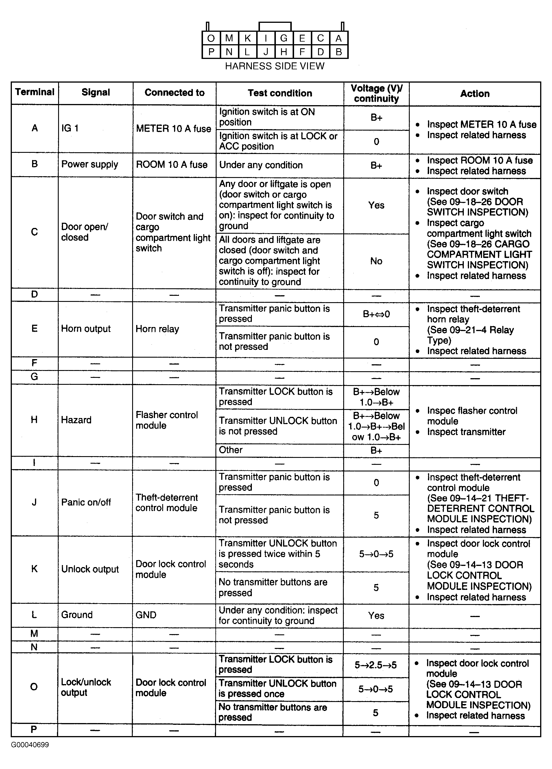 Locate keyless control module behind left rear trim panel. See Figure . Leave keyless control module connector attached. Using DVOM, backprobe specified terminals of keyless control module harness connector. See Fig 1 . Disconnect keyless control module connector before checking continuity at terminals "C" and "L". If voltage measurements and continuity checks are not as specified, check component and wiring. If component and wiring are okay, replace keyless control module. See KEYLESS CONTROL MODULE under REMOVAL & INSTALLATION.