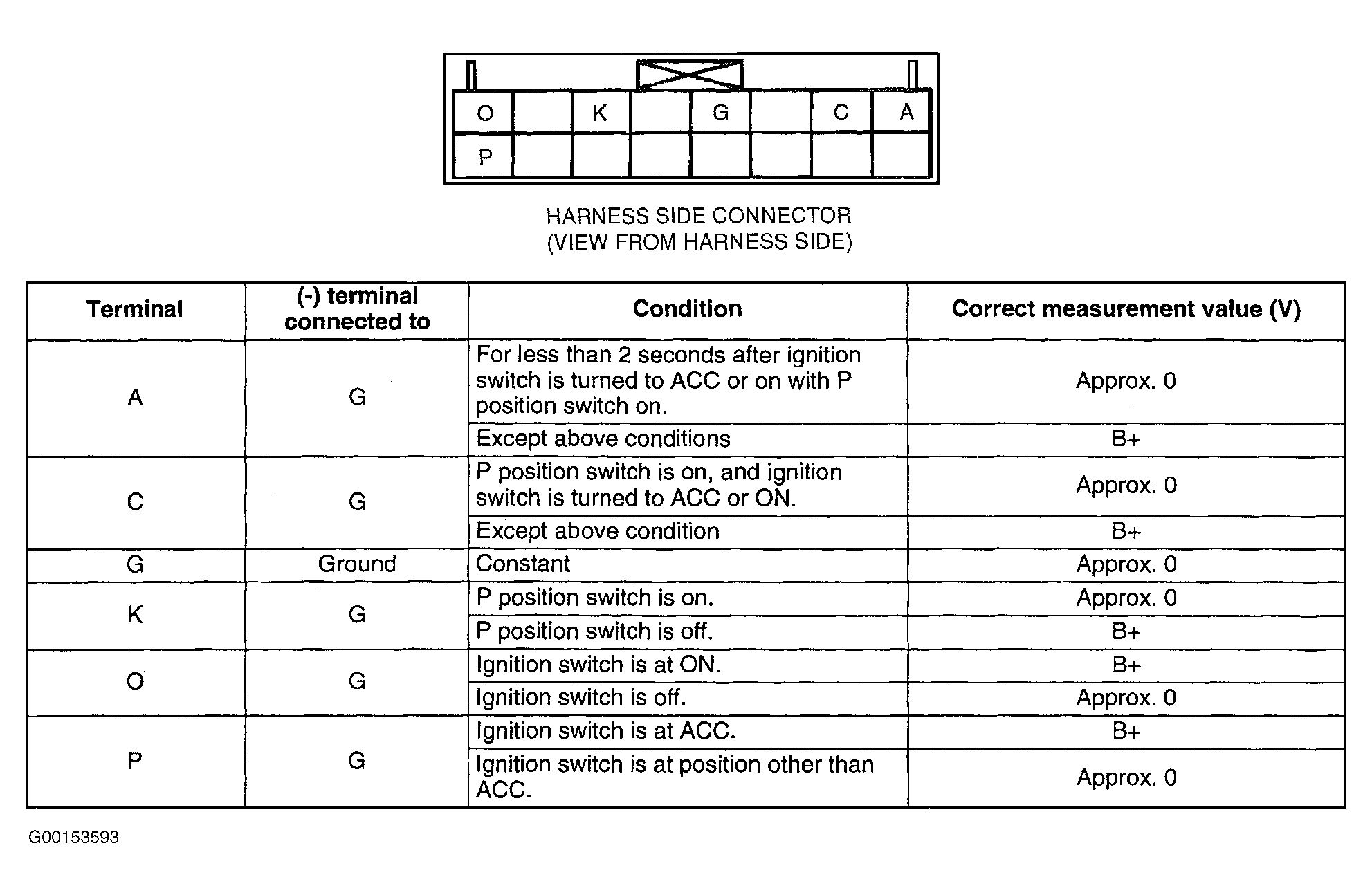 Remove front side trim. Turn ignition on. Inspect terminal voltages. See Fig 1 . If voltage is not as specified, repair wiring harness and/or key lock unit.