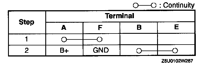 2. Apply battery positive voltage and check continuity between terminals of the main relay using an ohmmeter.