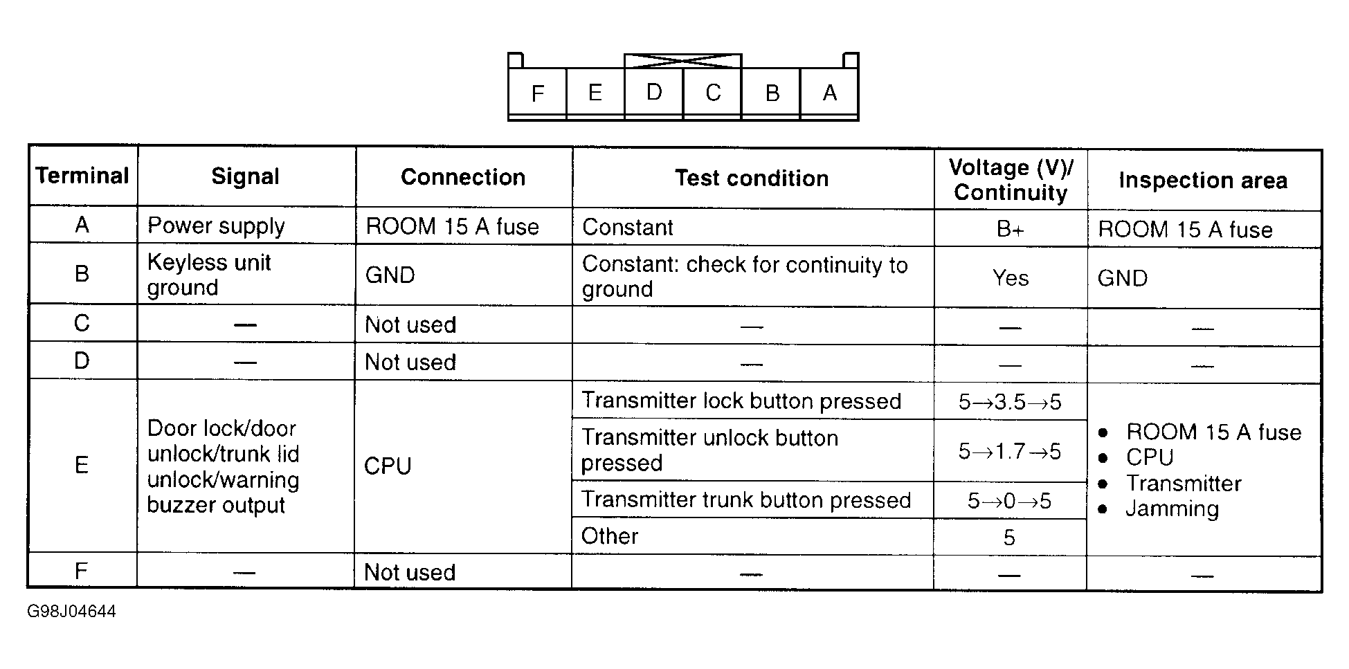 - Disconnect harness connector before checking continuity at terminal "B" (ground). If voltage measurements or continuity are not as specified, check related components and wiring harnesses. If items are okay, but system is still not functioning properly, replace keyless control module.