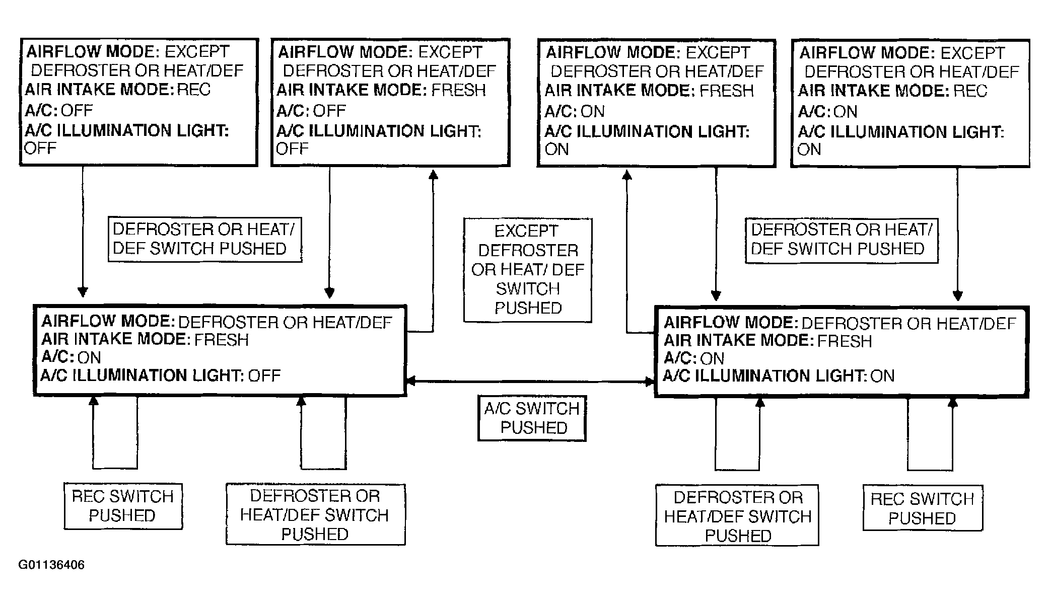 - The transition of air intake mode and A/C ON/OFF when the defroster control operates is as shown in Fig 2 .