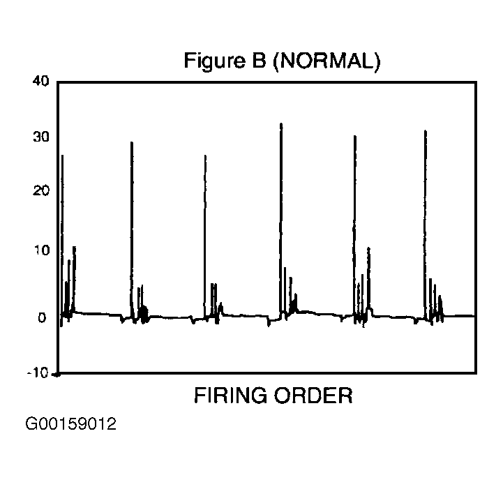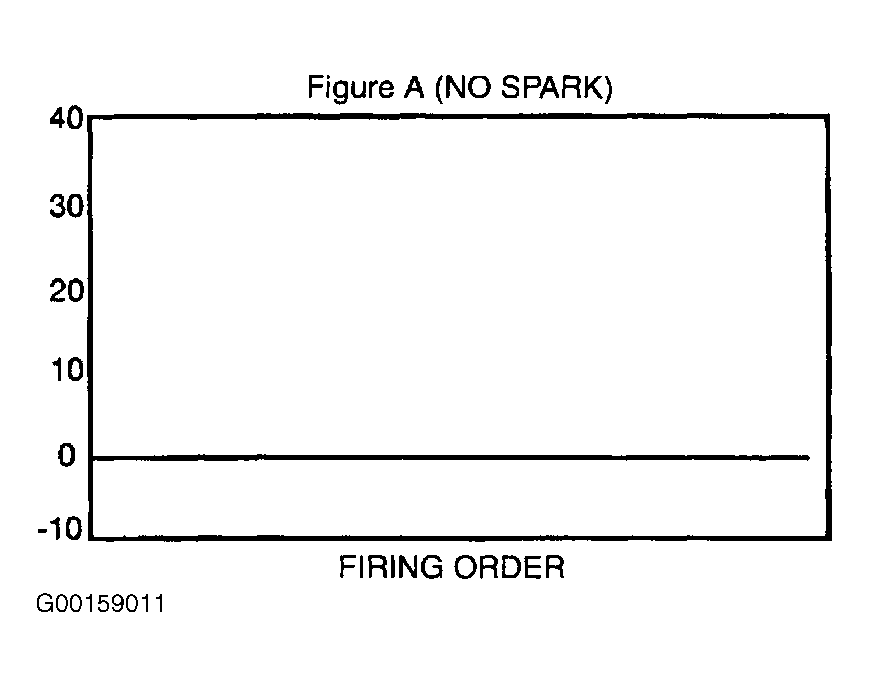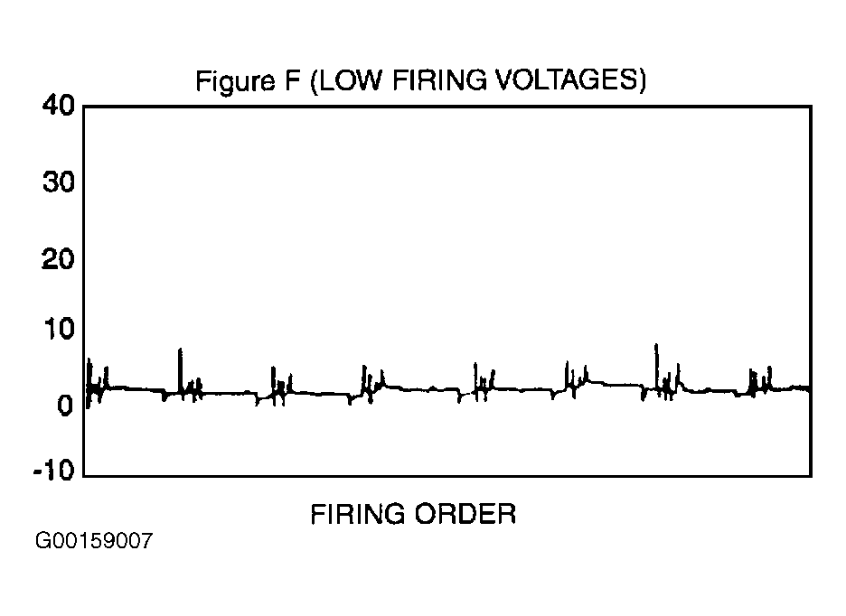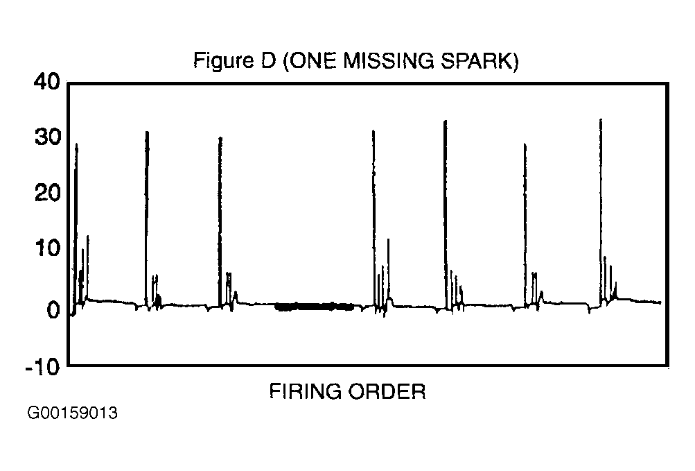 Observe pattern on scope while cranking engine. See to Fig 1 . If pattern is flat, which indicates no spark on all cylinders, turn ignition off. Check condition of related fuses/fuse links. If okay, repair open circuit. If fuse/fuse link is damaged, check IGN START/RUN circuit for short to ground. Repair as necessary. Complete FUEL OR MISFIRE MONITOR REPAIR VERIFICATION DRIVE CYCLE under MONITOR REPAIR VERIFICATION DRIVE CYCLES under DRIVE CYCLE PROCEDURES. If pattern is not flat, go to next step.NOTE: Spark plugs are fired up to four strikes per firing. Multi-strike operating mode is dependent on PCM calibration and is limited to less than 2000 RPM. Above 2000 RPM, spark plugs are fired once per firing. - Check For Normal Ignition Pattern