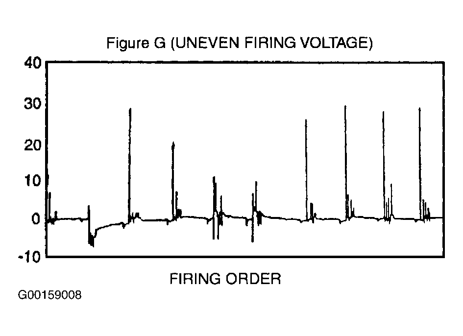 Check spark plug firing voltage average and evenness. See Fig 7 . If evenness of spark plug firing voltage is more than 8KV, proceed as follows:- Inspect spark plug wires and spark plugs.