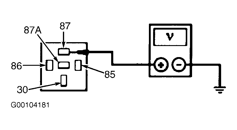 2. Using two jumper wires, connect relay terminals No. 86 and 30 directly to the positive battery terminal. Check for voltage at terminal No. 87A. If battery voltage is not indicated, replace the relay. If battery voltage is indicated, connect a third jumper wire to terminal No. 85, and ground the jumper wire to a known good ground. Check for voltage at terminal No. 87. If battery voltage is not indicated, replace the relay.