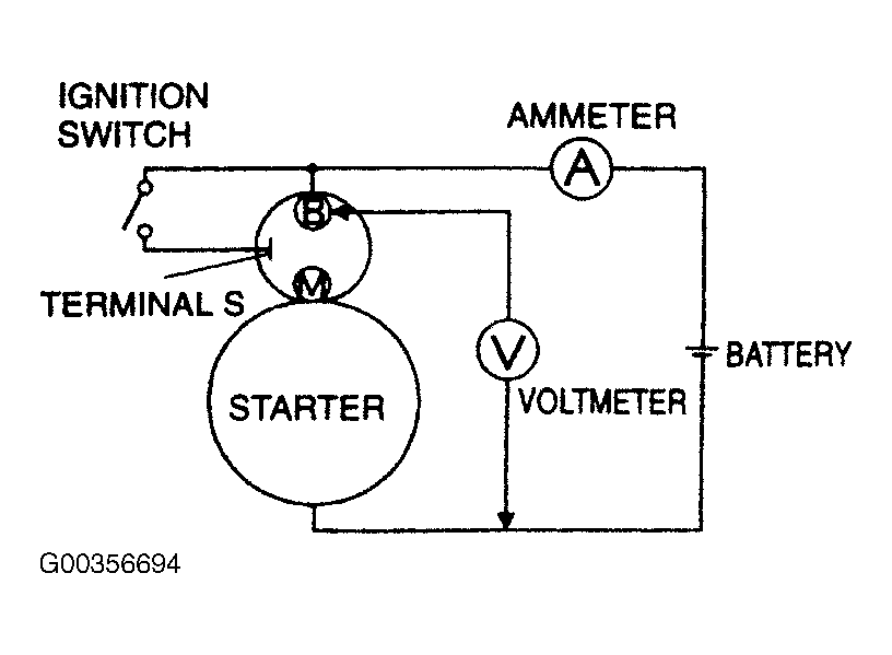 Verify that the battery is fully charged. Connect the starter, battery, voltmeter and ammeter as shown in the illustration. See Fig 1 . Measure the voltage and current as shown in table. See NO-LOAD TEST SPECIFICATIONS table. Letters in parenthesis in table refer to letters in the illustration. If voltage is less than specified or amperage is more than specified, repair or replace starter or parts as necessary.