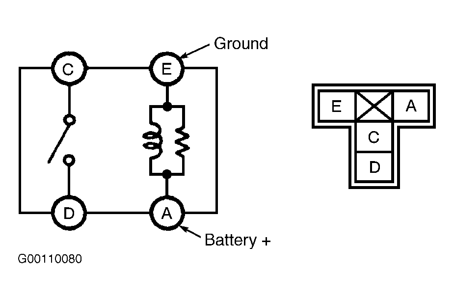Remove fuel pump relay. See FUEL PUMP RELAY LOCATIONS table. Using ohmmeter, check for continuity between relay terminals "C" and "D". See Fig 1 . Continuity should not be present. Using fused jumper wires apply battery voltage to terminal "A" and ground terminal "E". Continuity should be present between fuel pump relay terminals "C" and "D" with battery voltage applied. If continuity is not as specified, replace fuel pump relay.