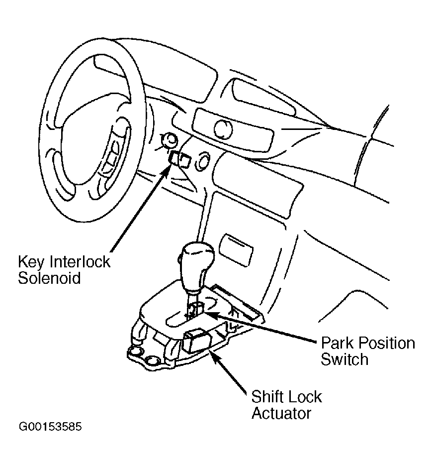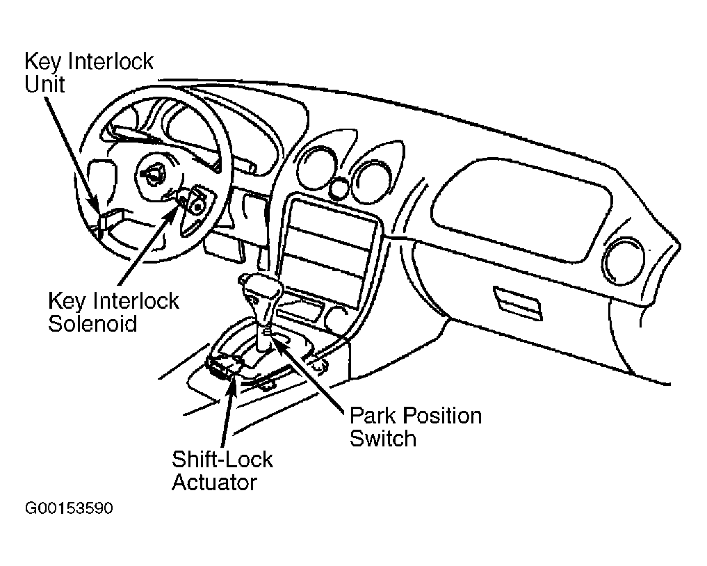 Vehicles are equipped with a electronically controlled shift interlock system. Shift interlock system prevents gearshift lever from being moved from "P" position unless brake pedal is depressed. Key cannot be removed from ignition switch unless gearshift lever is in "P" position. In case of a malfunction, gearshift lever can be released by depressing shift interlock emergency override button located near gearshift lever. System consists of brakelight switch, shift lock actuator, park position switch and shift interlock override button. For Miata and Millenia models, see Fig 1 and Fig 2 . System is controlled by shift lock control unit incorporated in shift lock actuator.