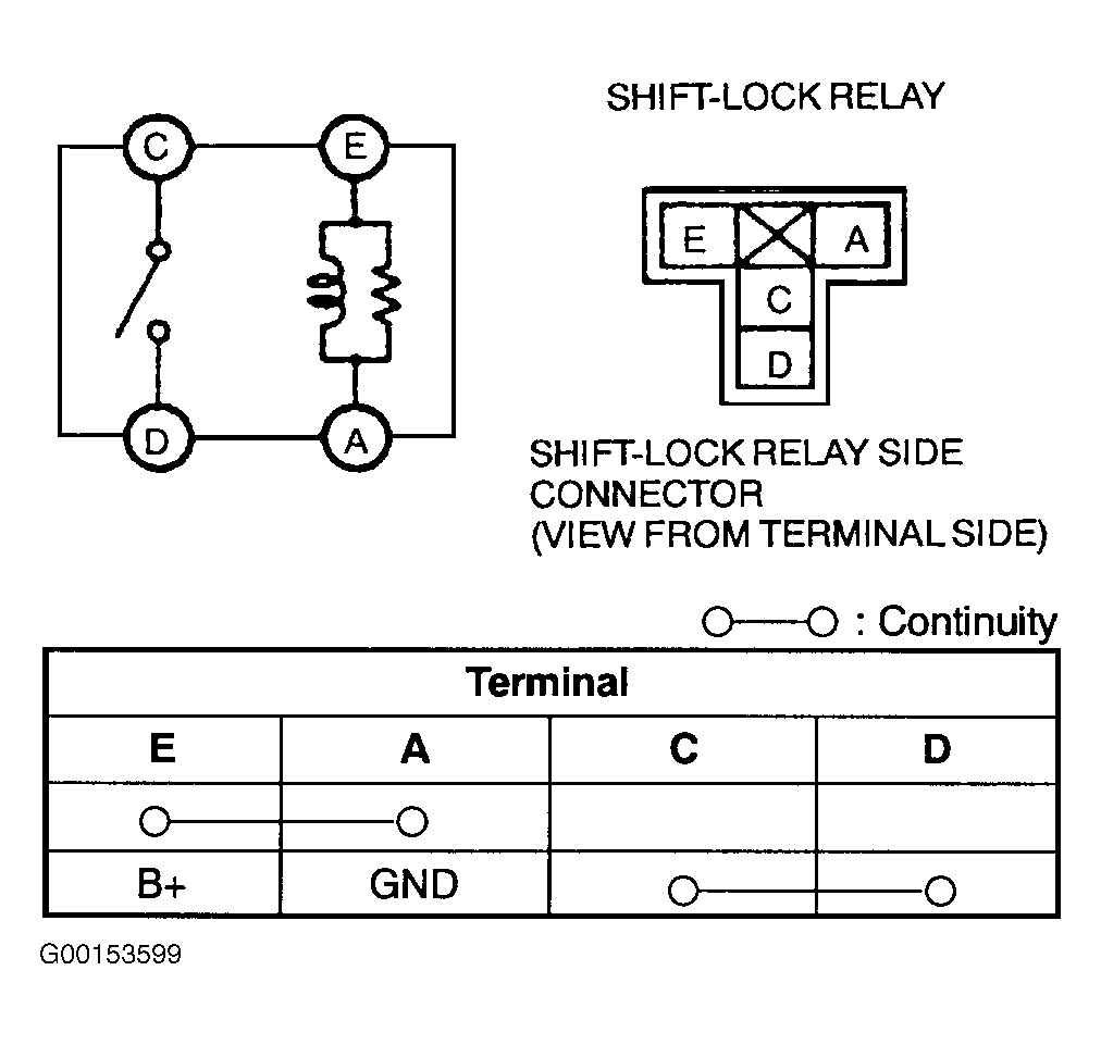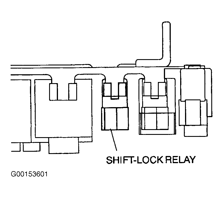 Disconnect shift lock relay harness connector. Relay is located under left side of instrument panel. See Fig 1 . Inspect voltage and continuity between shift lock relay terminals. See Fig 2 . Replace relay as needed.