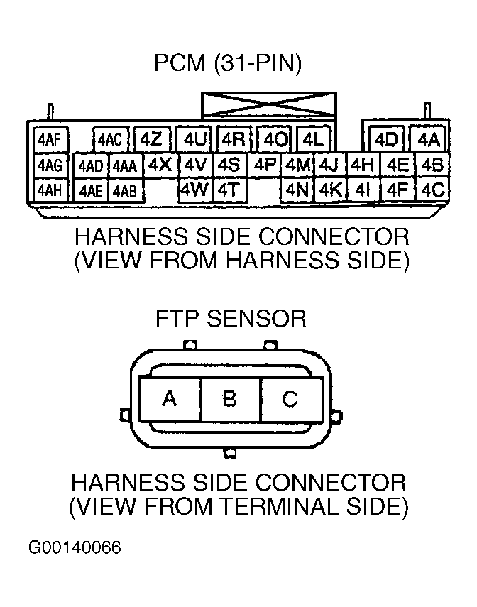 - Turn ignition off. Leave FTP sensor harness connector disconnected and disconnect PCM 31-pin harness connector. See Figure. Check continuity between ground and PCM harness connector terminal "4AB" (Red/Green wire). If continuity is found, repair short to ground (in Red/Green wire) between FTP sensor and PCM. After repair, go to next step. If continuity is not found, check FTP sensor ground and signal circuits for shorts, repair or replace as necessary and go to next step.