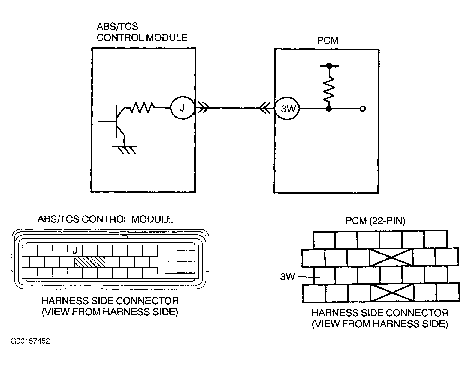 - Short to ground circuit between ABS/TCS control module terminal "J" and PCM terminal "3W".