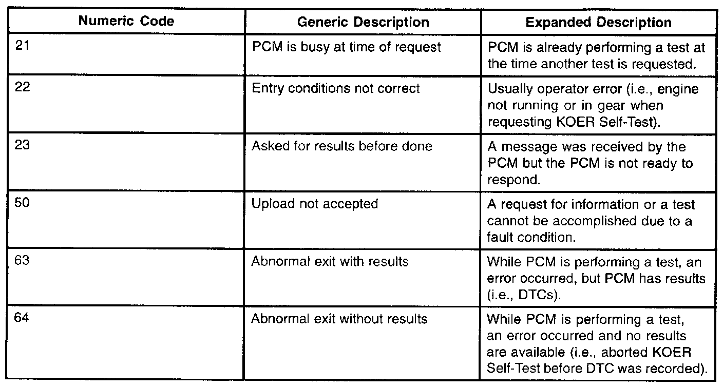 It is possible to receive a communication error from a WDS or equivalent when initiating a diagnostic test or accessing PIDs. The communication error can be caused by operator error, the vehicle wiring, connectors, the PCM or other control modules connected to the DLC wiring. The PCM will respond to a WDS or equivalent whenever the tool requests a test. These are not DTCs. Listed in the table are numeric codes and generic descriptions that a scan tool may display when trying to perform some PCM operations. It is possible to get other numeric codes not listed. For a complete list of communication response codes, Refer to Society of Automotive Engineers (SAE) document J2190 enhanced E/E Diagnostic Test Modes. Some are normal responses to valid requests. The others are communication error responses. If the tool displays any of the communication error responses check scan tool connections, cable/adapters and entry of vehicle information.