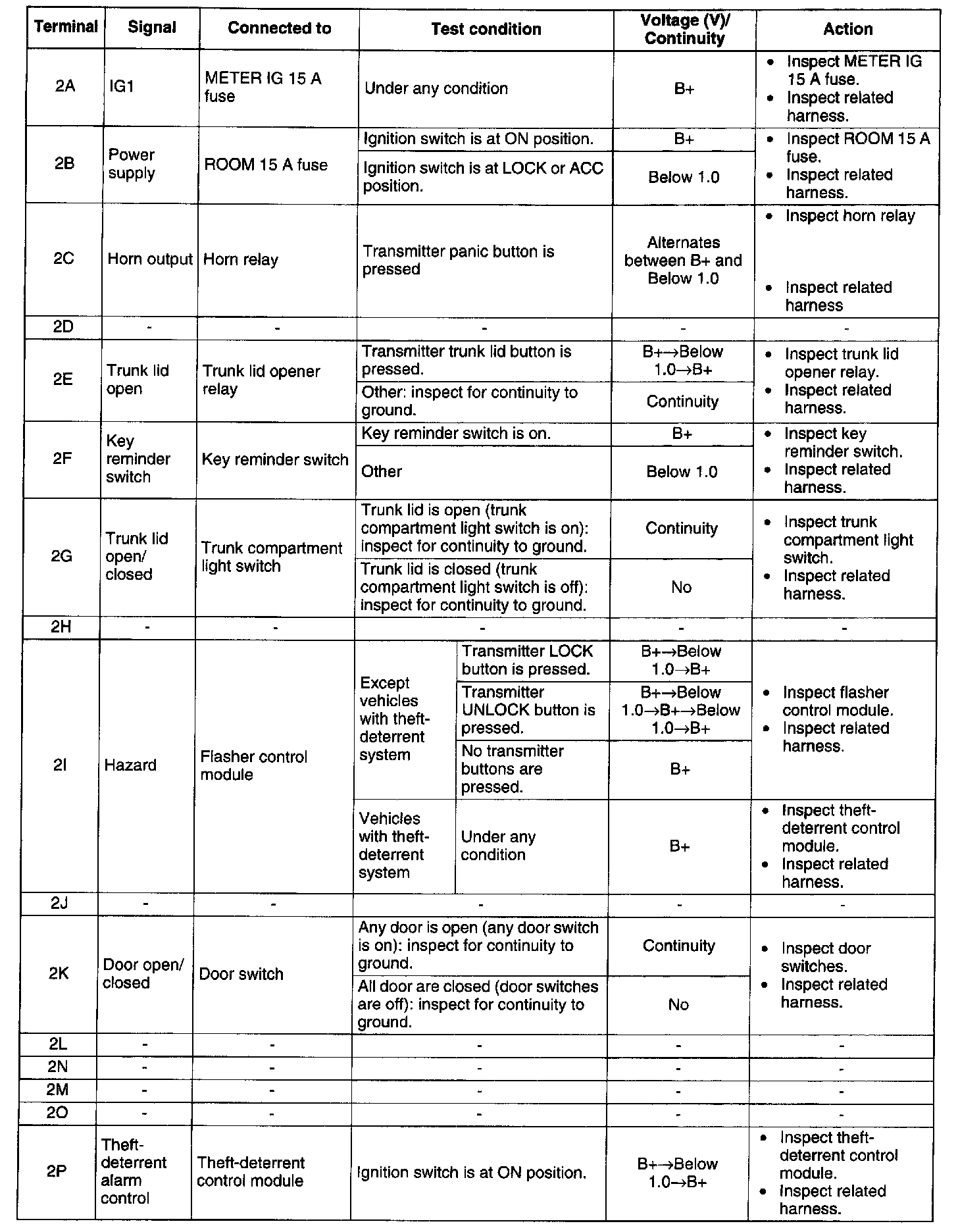 Terminal Voltage List (Reference) (Terminal 2O - 2X):