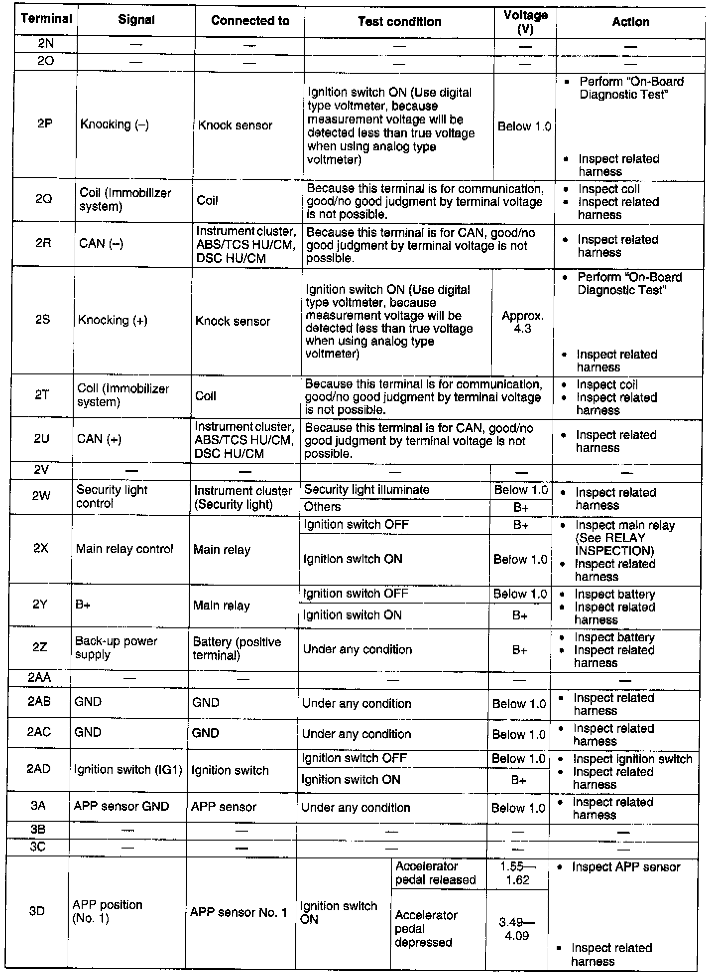 Terminal Voltage Table (Reference) - Terminals (2E - 2M):