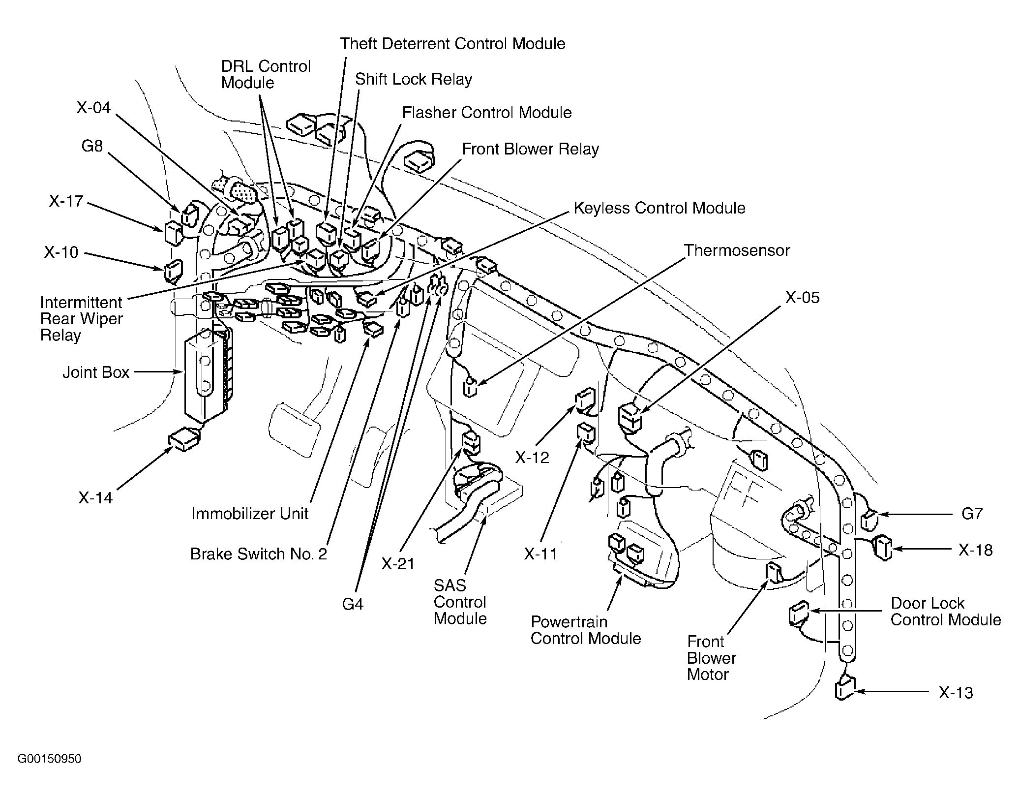 | Keyless Control Module | Behind left side of dash. See Figure. |