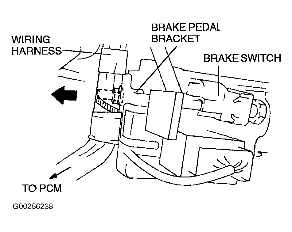- Push the PCM harness, attached to the brake pedal bracket, in the opposite direction of the brake pedal bracket. See Fig 2.