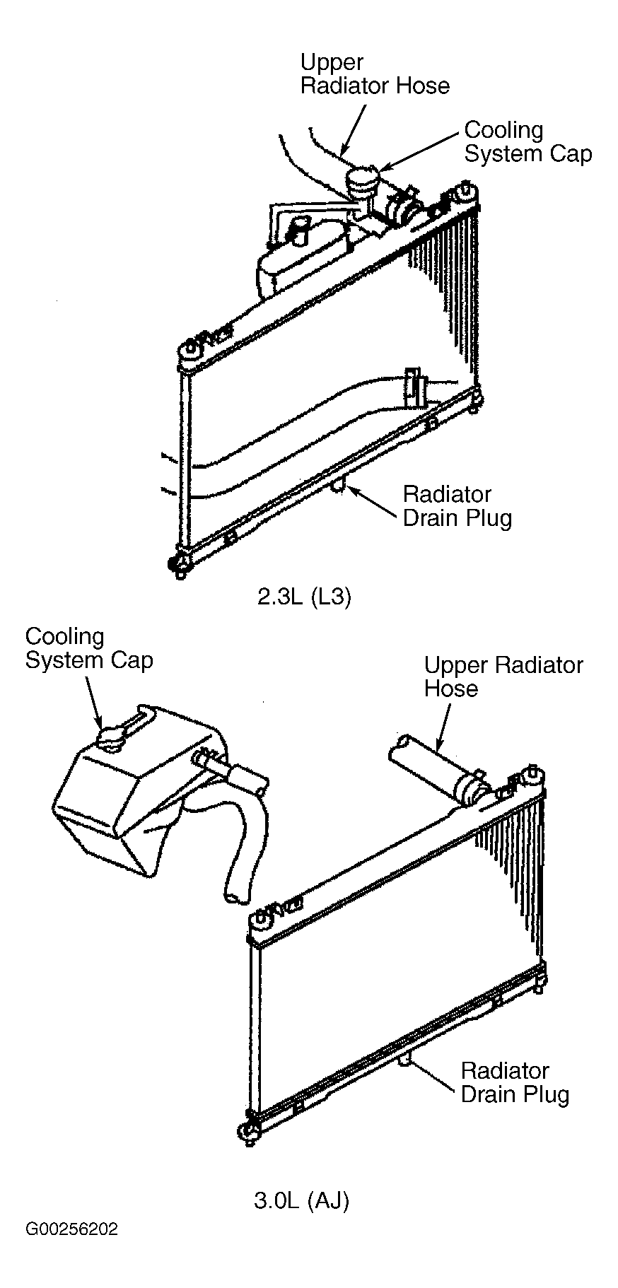 - Inspect the coolant level. If it is low, repeat steps 1- 6 on 2.3L models or steps 2- 6 on 3.0L models.
