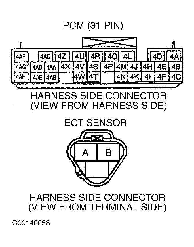 - GND circuit (Black/Red wire) between ECT sensor 3-pin harness connector terminal "B" and PCM 31-pin harness connector terminal No. 4O through common connector.