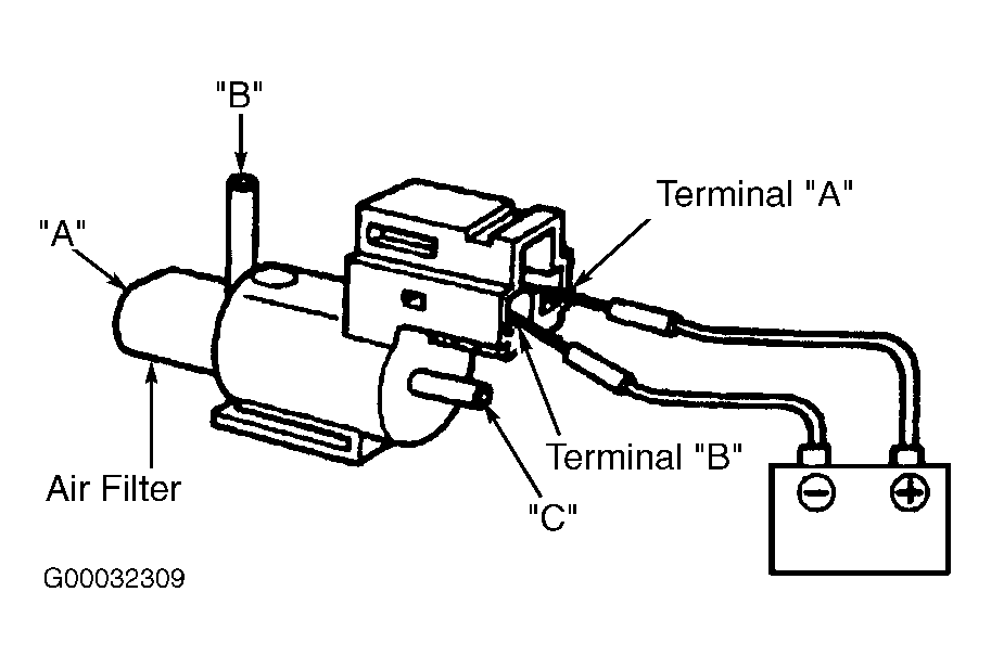 Disconnect vacuum hose from PRC solenoid valve. See PRC SOLENOID VALVE LOCATIONS table. Apply air pressure to PRC solenoid valve port "B". See Fig 1. Air should flow from port "C" only. Using fused jumper wires, apply battery voltage to solenoid terminals. Apply air pressure to PRC solenoid valve port "B". Air should flow through PRC solenoid valve air filter (port "A") only. If PRC solenoid valve operation is not as specified, replace PRC solenoid valve.