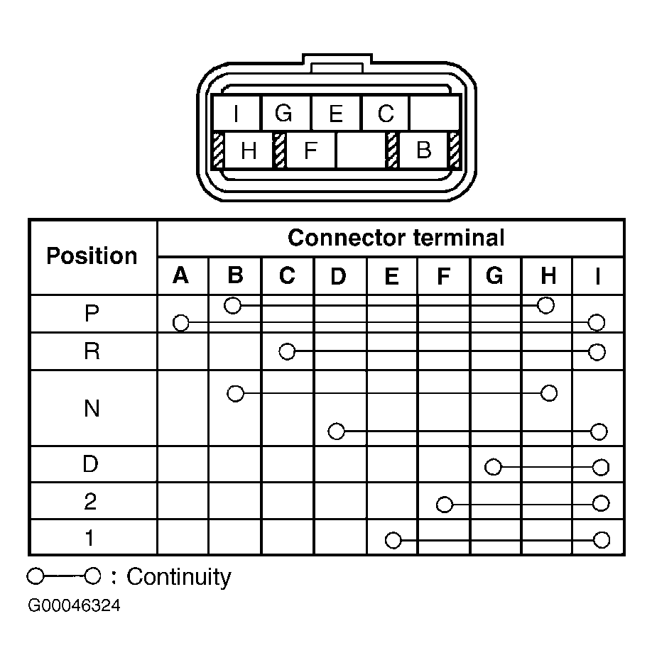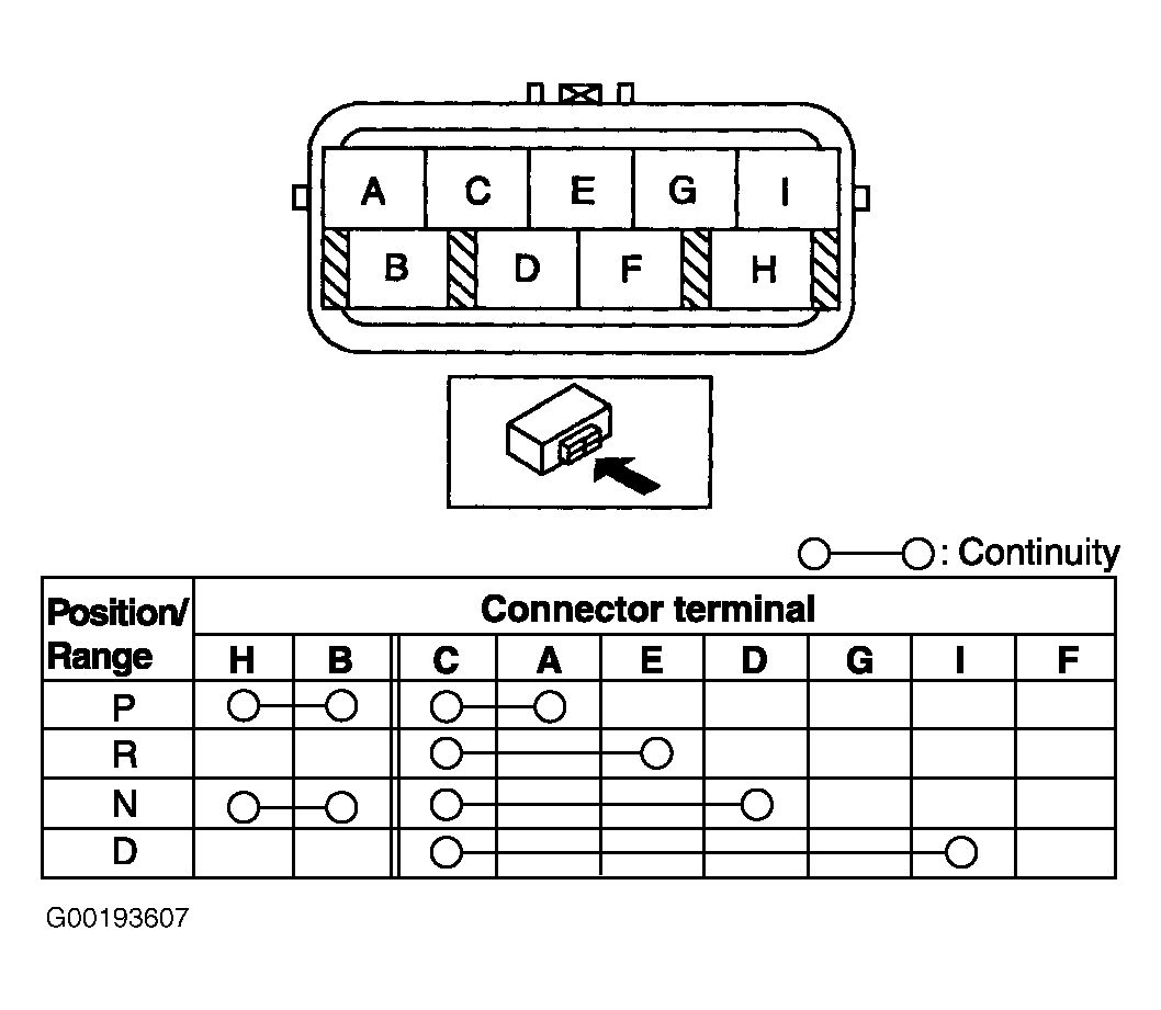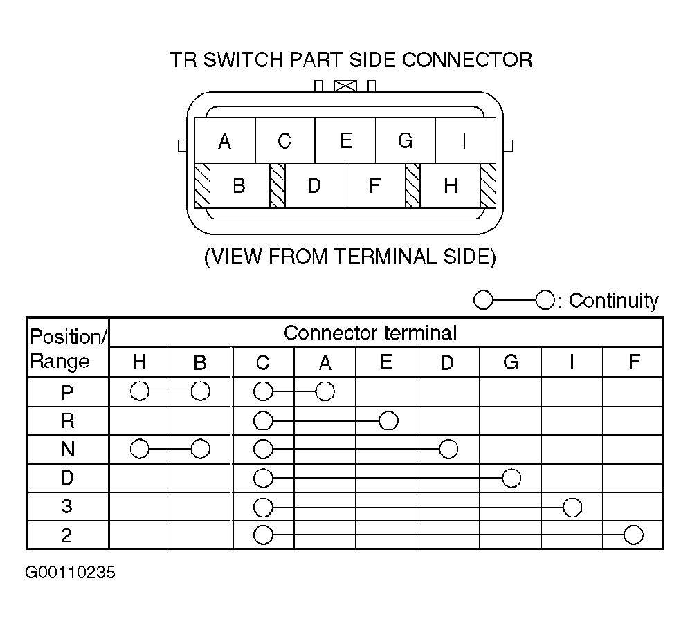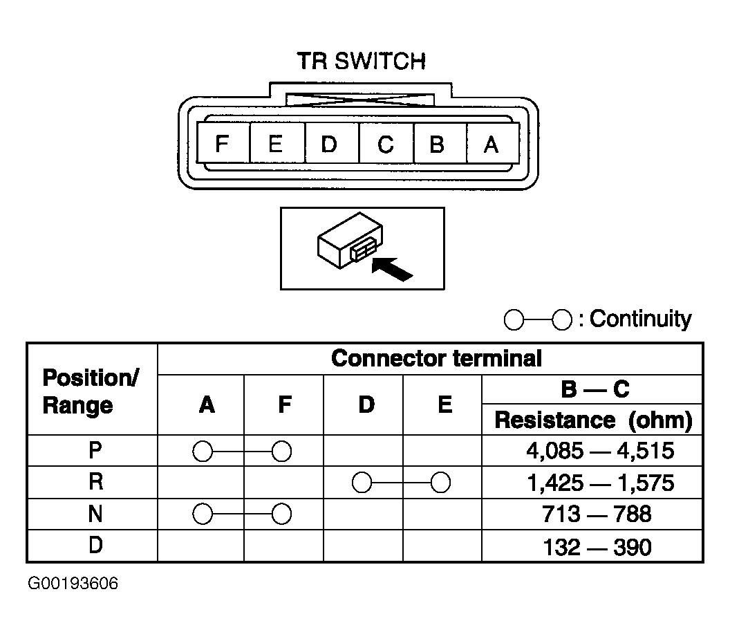 - To test switch, disconnect Transaxle/Transmission Range (TR) switch harness connector. Check for continuity between specified terminals at TR switch. See Fig 1, Fig 2, Fig 3, Fig 4, Fig 5 or Fig 6
