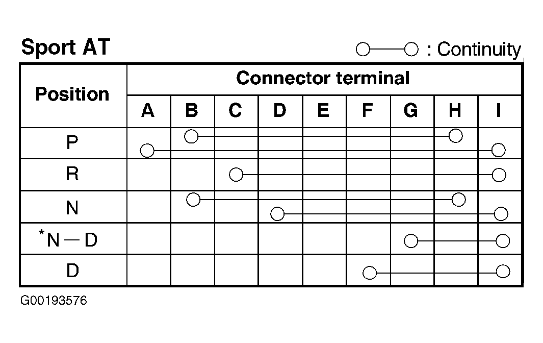 - Check for starter operation with ignition switch in START position and shift lever in "P" and "N" position only. Ensure back-up lights illuminate with ignition in "ON" position and selector lever in "R" position.