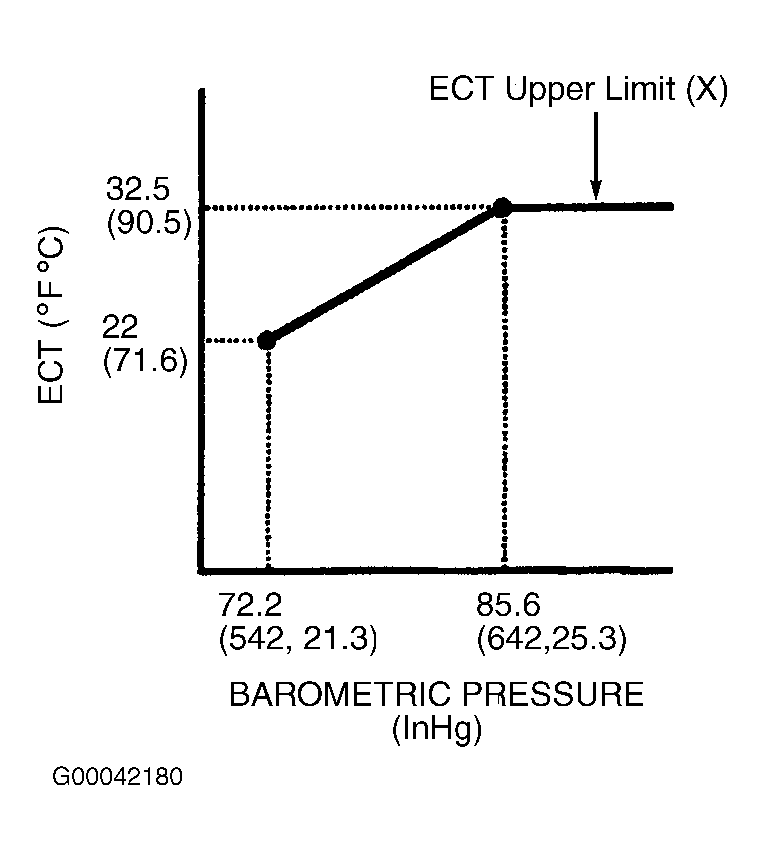 • Engine coolant temperature: 14-X°F (-10-X°C). X = engine coolant temperature upper limit as determined by barometric pressure shown in graph. See Figure.