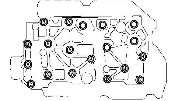 8. Hand-tighten the bolts shown in the figure. Each type of bolt has a different letter on its head. Match the bolt letter with the letter stamped next to its installation hole on the valve body.