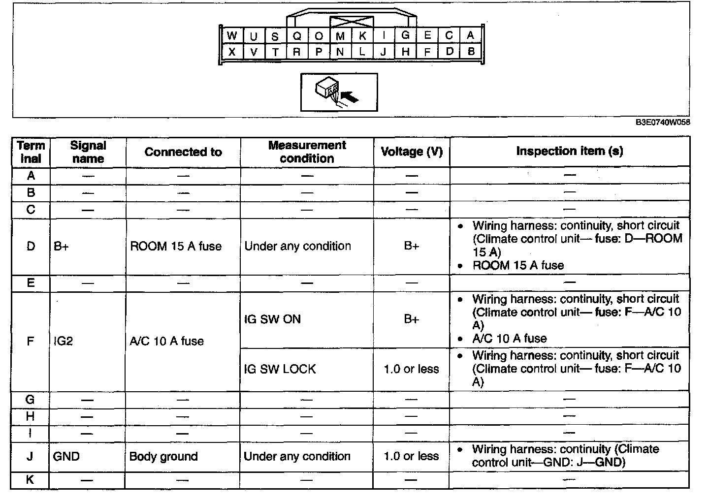 4. By inserting the positive (+) lead of the tester into each climate control unit terminal, measure the voltage according to the terminal voltage table.