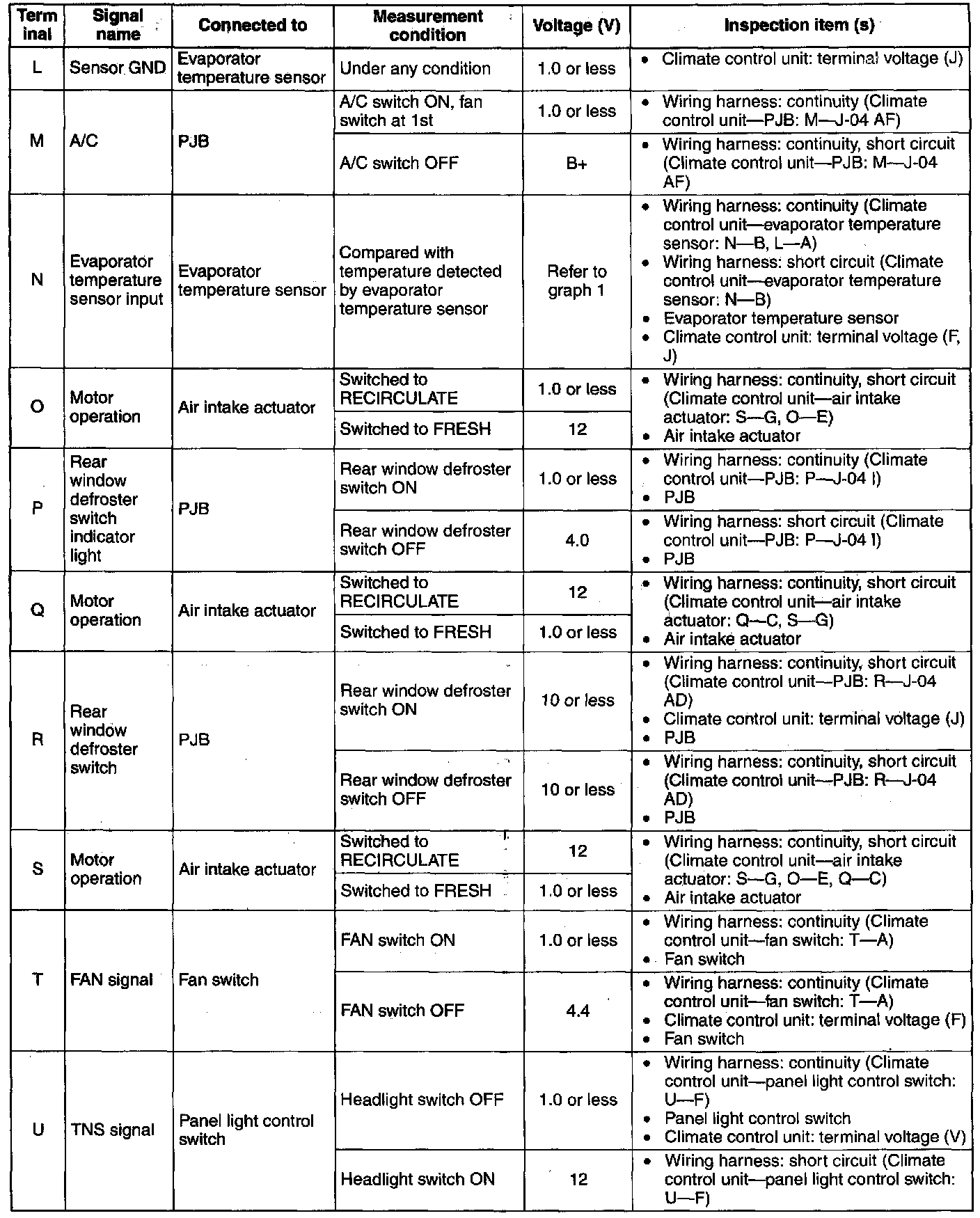 - If the parts under "Inspection item (s)" are found to be normal, replace the climate control unit.