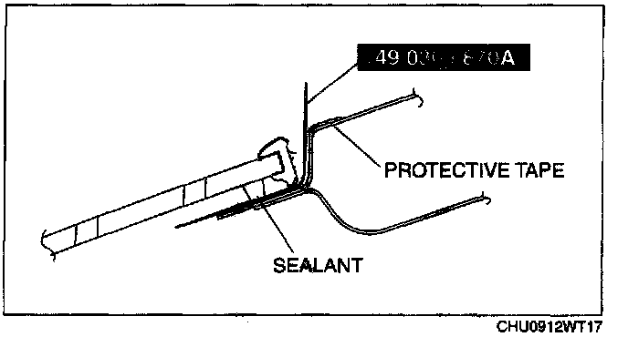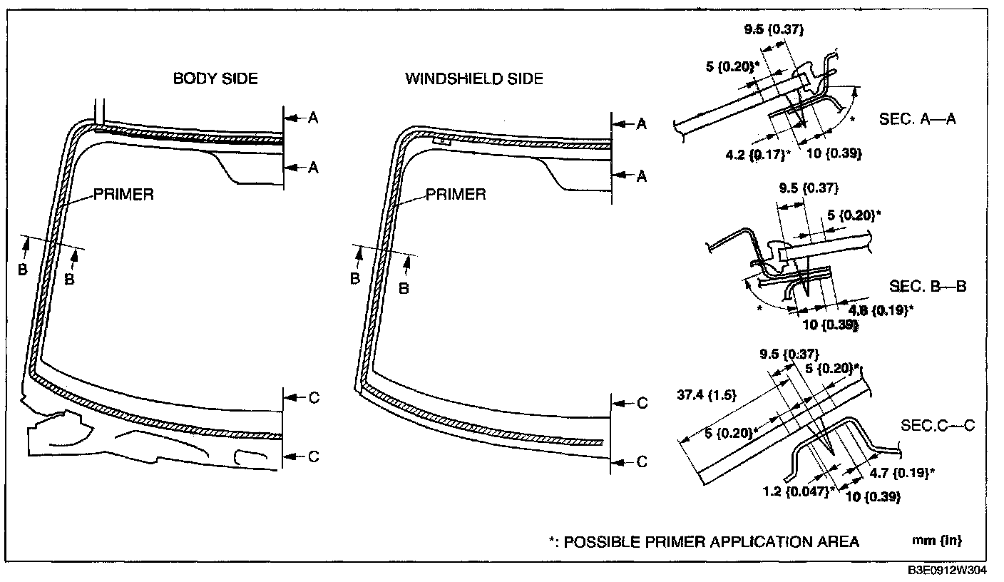2. If the sealant has come off completely in any one place, apply some primer after degreasing, and allow it to dry for approx. 30 min. Then apply a 2 mm {0.08 in} thickness of sealant.