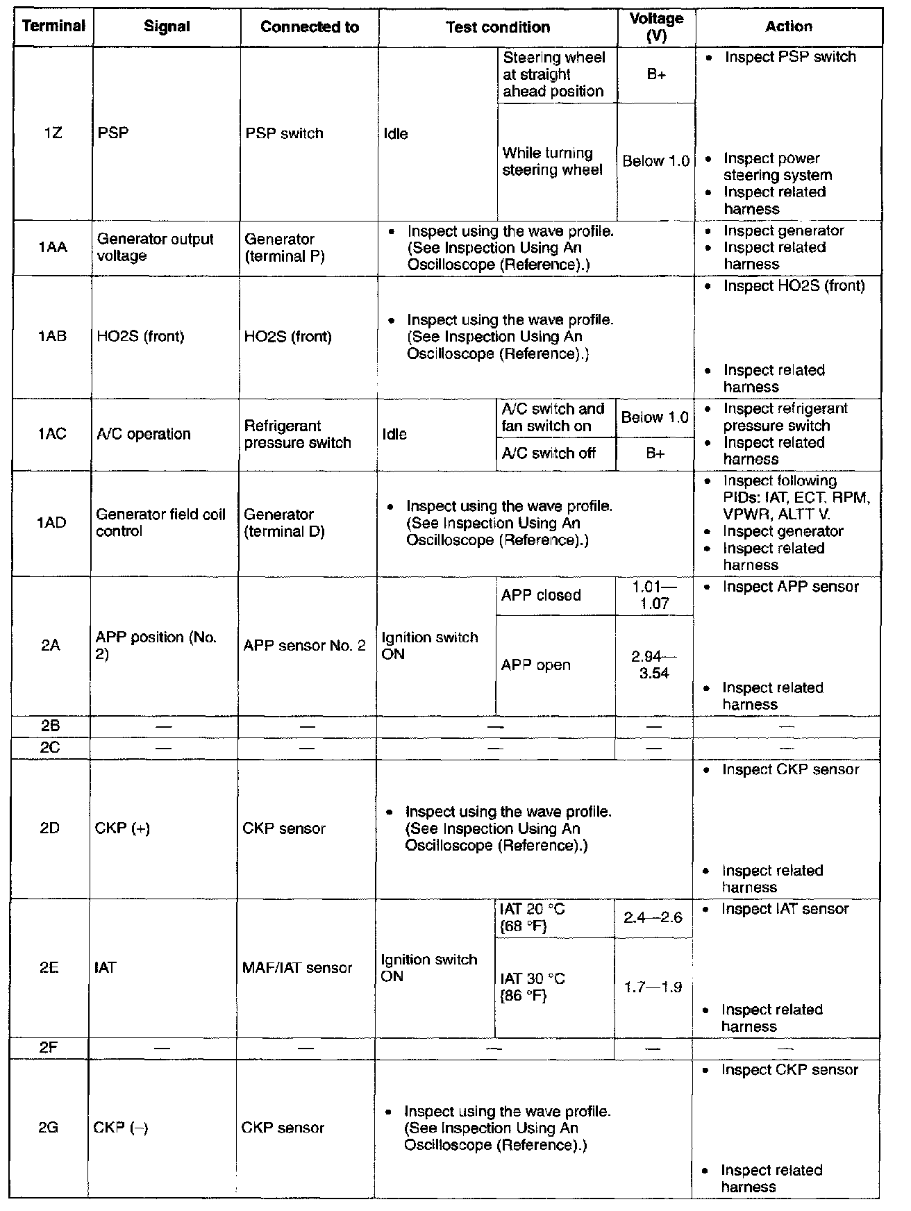 Terminal Voltage Table (Reference) - Terminals (1Z - 2G):