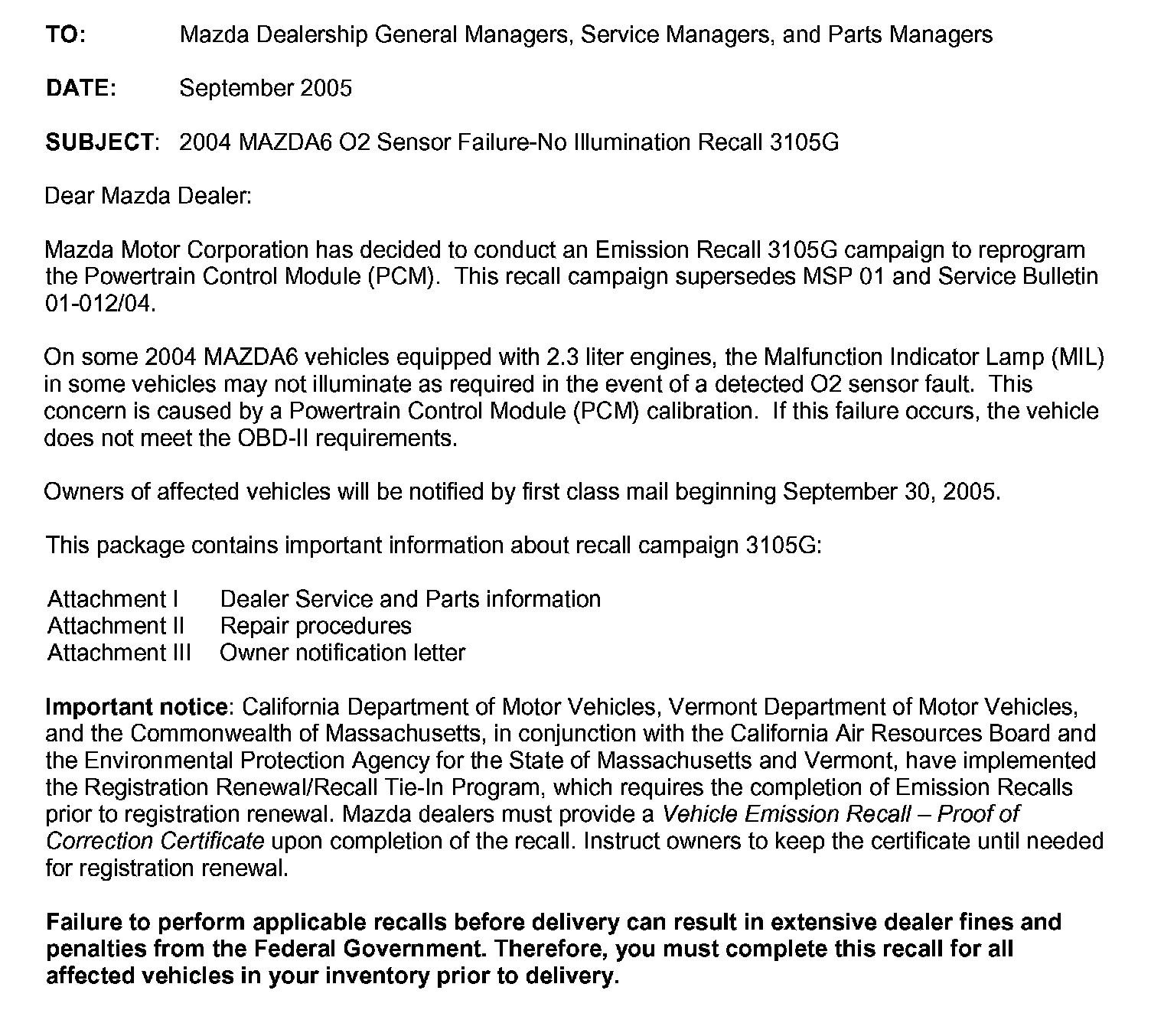 Recall - PCM/TCM Reprogramming for O2 Sensor Fault