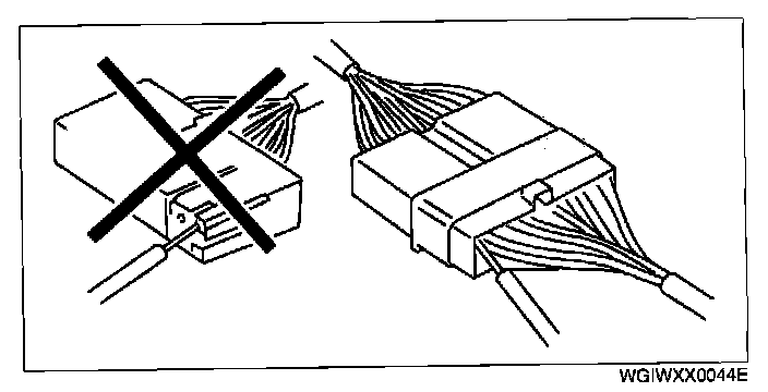 - When a tester is used to inspect for continuity or measuring voltage, insert the tester probe from the wiring harness side.