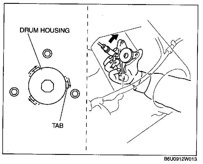 6. Insert hand through the speaker installation hole, rotate the regulator drum housing in the direction shown in the figure, and disengage the regulator drum housing from the door unit connection tabs.