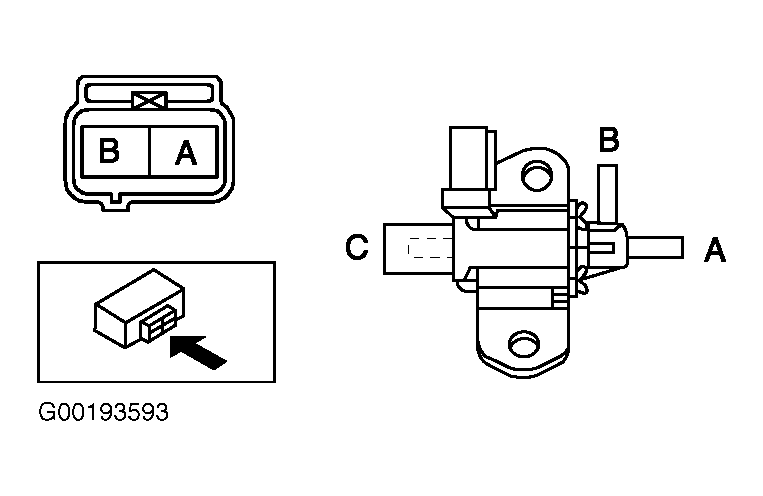 Disconnect negative battery cable. Remove VTCS solenoid valve. Apply air pressure to port "B". See Figure. Air should flow from port "C". Using fused jumper wires, apply battery voltage to VTCS solenoid valve terminals. Apply air pressure to port "B". Air should flow from port "A". If airflow is as specified, check for open or short circuit. Go to next step. If airflow is not as specified, replace VTCS solenoid valve. - Open Circuit Inspection