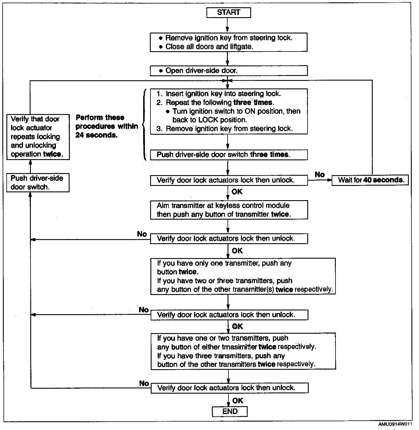- When programming the ID code into a keyless control module, verify that other transmitters are not being operated in the vicinity.