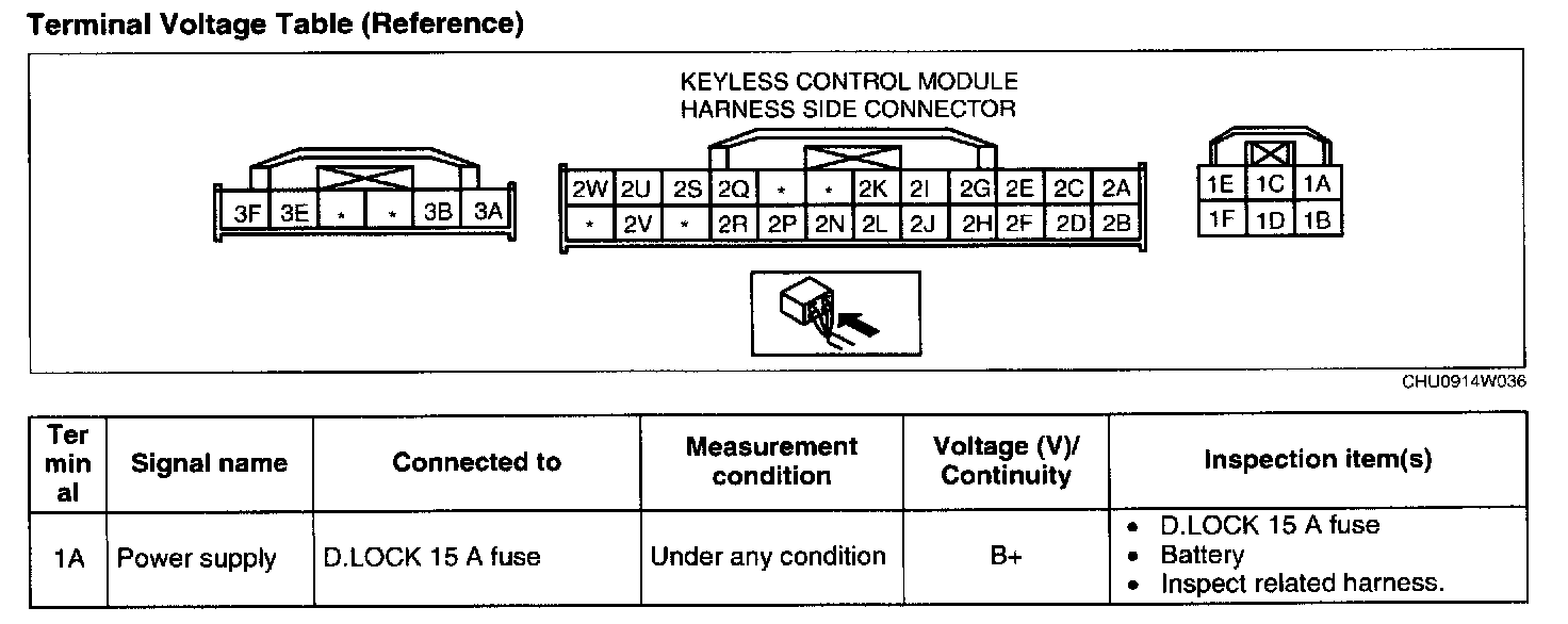 KEYLESS CONTROL MODULE INSPECTION1. Measure the voltage or inspect for continuity according to the Terminal Voltage Table (Reference).