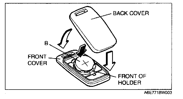 3. Install a new battery (CR2025) into the front portion of the holder with the positive pole (+) facing up. Press on the B portion of the battery to set the battery.