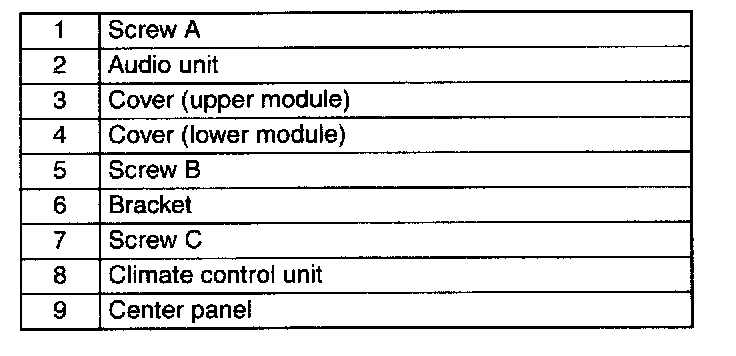 CENTER PANEL MODULE DISASSEMBLY/ASSEMBLYCAUTION: Before disassembling the center panel module, spread a cloth on the floor to put the disassembled parts on. This protects the surface of the panel from scratches or dirt.