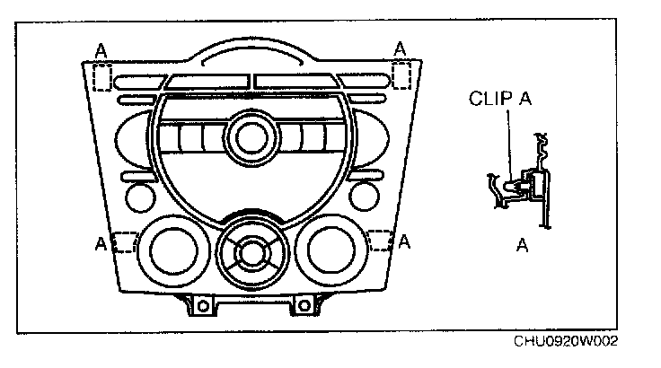 1. Pull the center panel module outward, detach clip A from the dashboard, and then remove the center panel module.